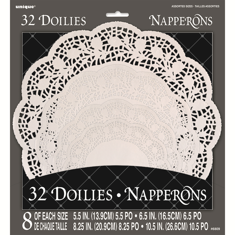 Pack of 32 Assorted White Doilies. It contains 8 each of these following sizes: 26.6cm, 21.5cm, 16.5cm, 13.9cm. Add a sense of charm and style to your tabletops with these beautifull Round Doilies. They are great for wedding birthday or any other party events.