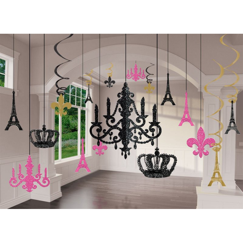 Pack of 17 Day In Paris Chandelier Decorating Kit - Glitter. Made of Cardboard & Foil. Contains: 1 X Hanging Chandelier 35.5cm, 4 X Hanging Eiffel Towers 27.9cm, 2 X Hanging Chandeliers 15.2cm, 2 X Hanging Fleur de Lis 15.2cm, 2 X Hanging Crowns 8.8cm, 3 X Foil Swirls w/Cutouts 13.9cm , 3 X Foil Swirls w/Cutouts 24.1cm.