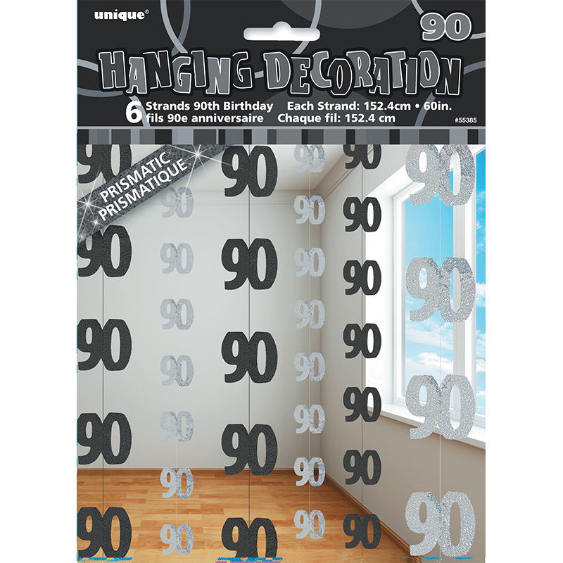 Pack of 6 Glitz Birthday Black Hanging Swirl Decoration 90TH . Each Strand: 152.4cm Height.