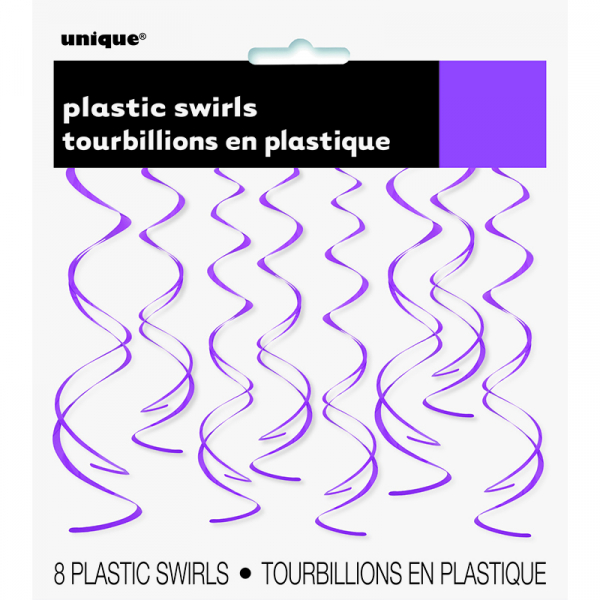 Pack of 8 Hanging Decoration Swirl Purple. The swirl measures about 66cm. Add simple elegance to birthday party, New Year's Eve party, wedding, or engagement party. Hang above a party table, or from a doorway or archway for a classic, subtle accent.