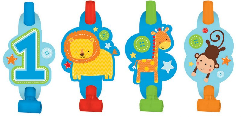 Pack of 8 One Wild Boy Blowouts. Size: 13cm. Made of Cardboard & Plastic.
