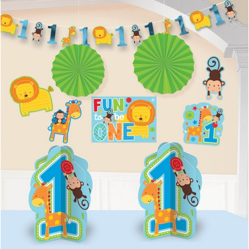 Pack of 10 One Wild Boy Room Decoration Kit. Contains: 1 x 3m Garland, 2 x 30cm Paper Fans, 4 x 25cm Cutouts, 1 x 35cm Cutout & 2 x 25cm Centrepieces.