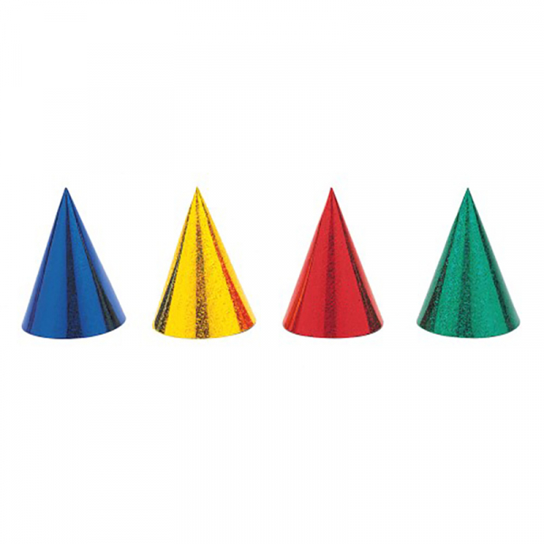 Pack of 8 Party Hats Prismatic Multi Colour. 8 Hats in total. 2 of each colour. One size fits most.