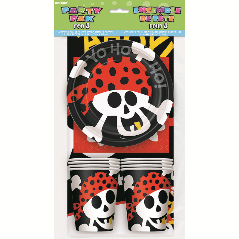 Pack of 25 Pirate Fun Party Pack. Inc 8 x Luncheon Napkins, 1 Plastic Tablecover, 8 x 18cm Paper Plates and 8 x 270ml Paper Cups.