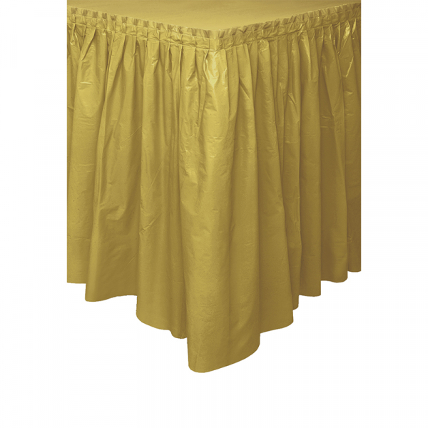 1 X Tableskirt Gold. Gold Table Skirt Is One length Measuring Approx 4.3M Long With A 73cm Drop And Is Suitable For Round, Square Or Rectangular Shaped Tables. Versatile And Ideal For A Variety of Occasions Including A Garden Wedding, Christening, Baby Shower Or A Birthday.This Table Skirt Will Transform Your Trestle Table Into The Perfect Party Table - Just Position The Skirt Along The Edge of Your Table With The Self-Adhesive Strip Backing Provided. Please Note White Tablecloth On Top of Table Is Sold Separately And Not Included.<BR/> Made of Plastic.