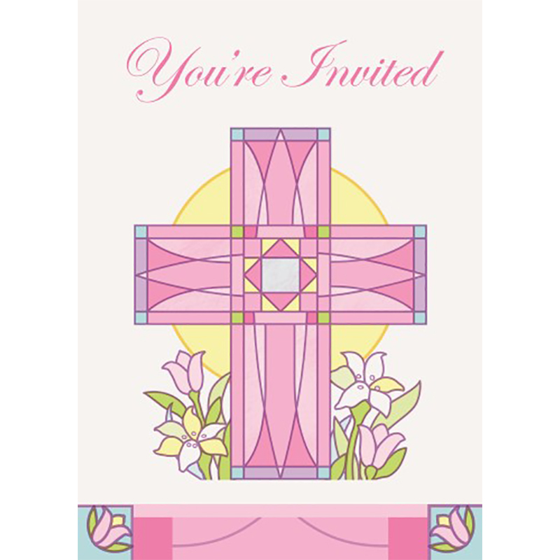 Pack of 8 Sacred Cross Pink Invitations. Invite measures approx. 13.5cm x 9.5cm. Invitations including envelopes. Great for Communions, Confirmations and Christenings.