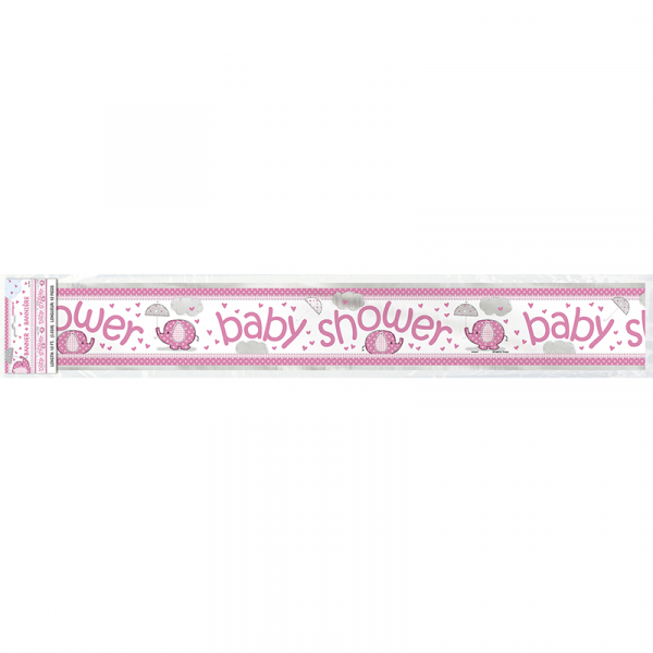 1 X Umbrellaphants Pink Foil Banner. About 3.66M In length And Features The Words "Baby Shower" Written In Pink Lettering Surrounded By Adorable Pink Elephants Carrying Umbrellas.